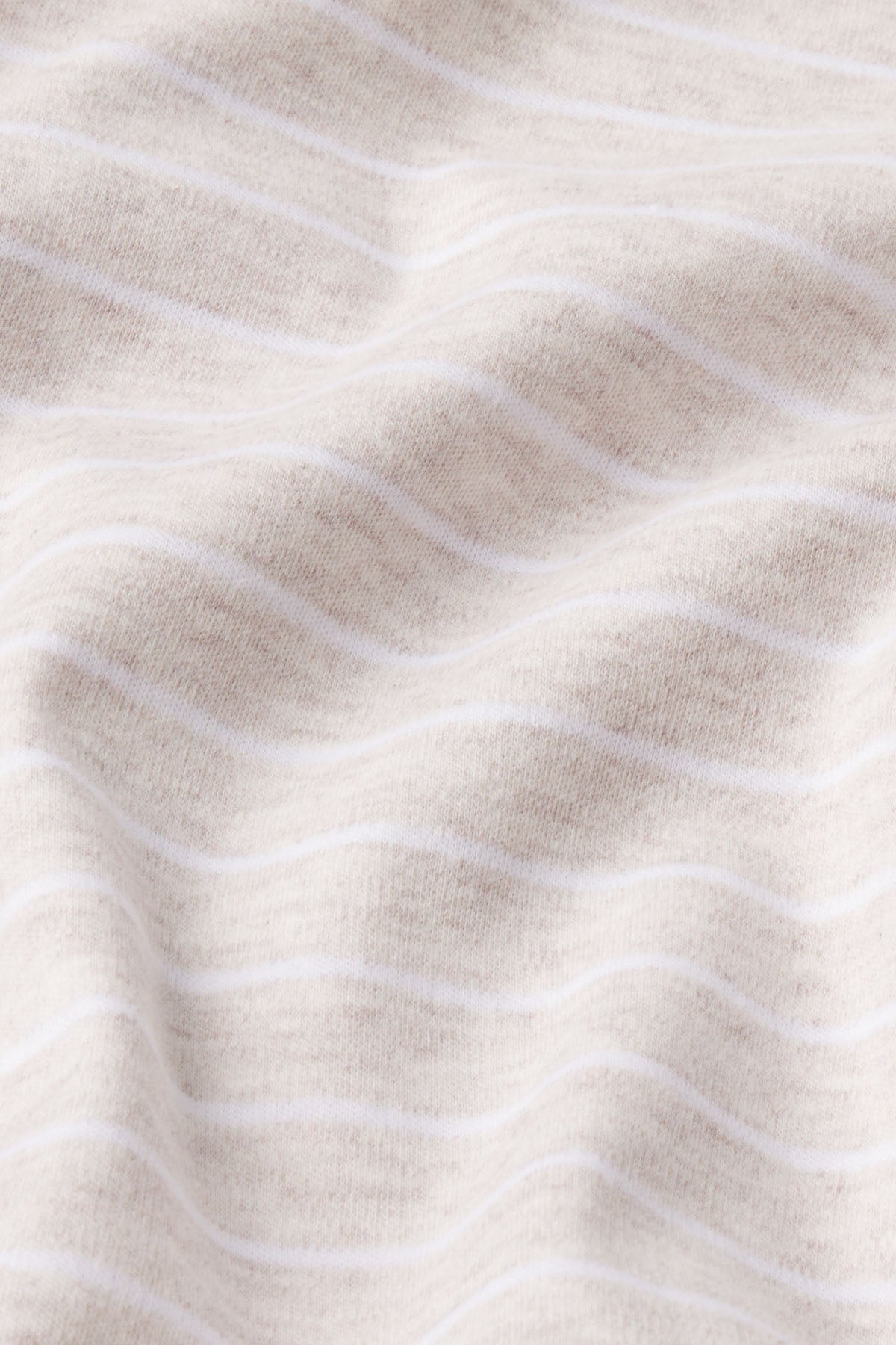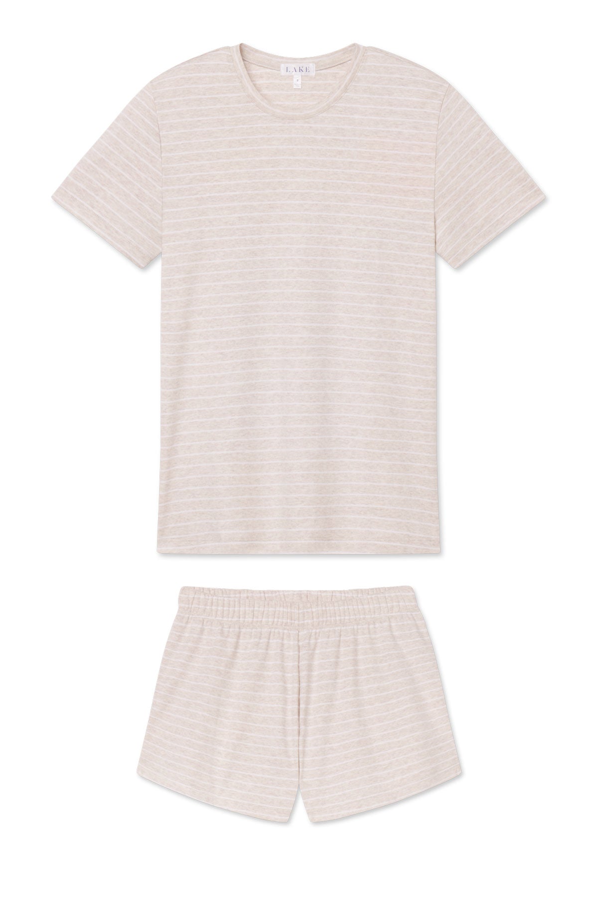 The Crew Shorts Set in Oat Heather Rowing Stripe, white stripes on heathered light taupe, features a fitted crewneck top. The shorts have an elastic waistband and straight-edge hem. Made from 100% Pima cotton.