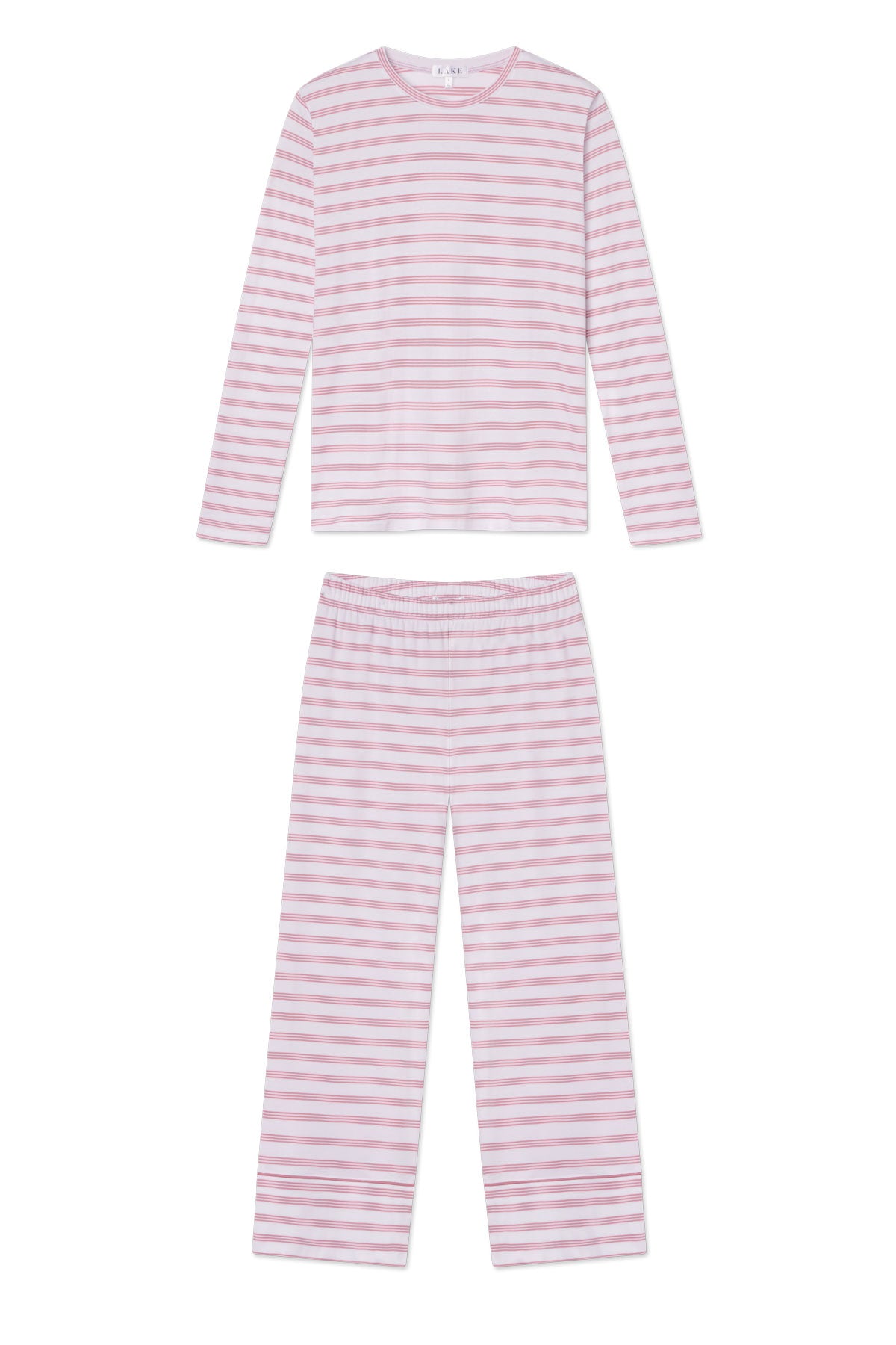 The Pima Crew Long Sleeve Wide Leg Pant Set in Light Camellia Triple Stripe, a thin, pink stripes set on white, features a long-sleeve crewneck top and cropped, wide-leg pants with tonal piping at the cuff. This style delivers the fit you know and love from our bestselling Pima Crew Wide Leg, now perfected for the colder months. Made from 100% Pima cotton.