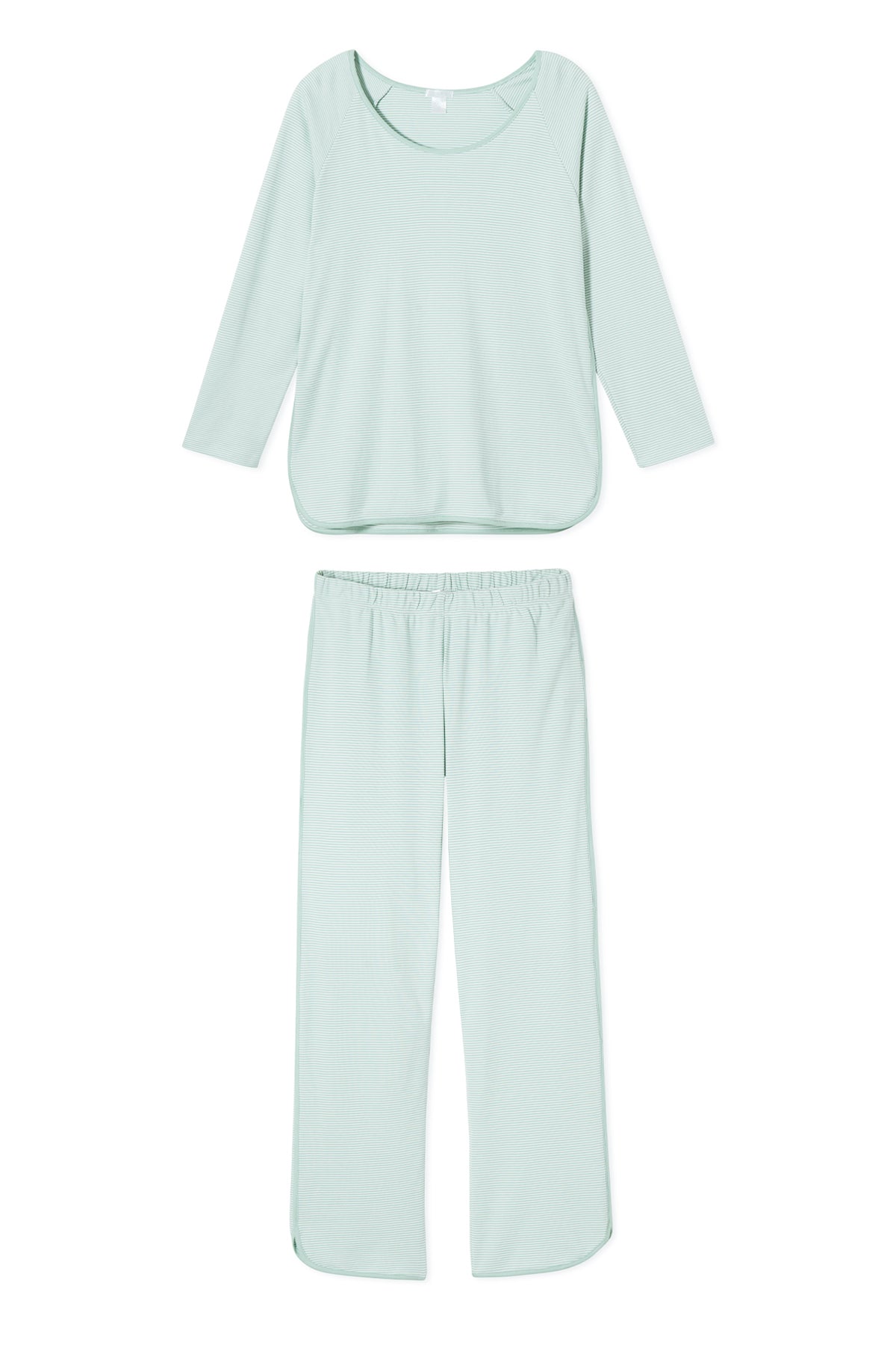 The Pima Long-Long Set in Parisian Green features a three-quarter sleeve scoop neck top and pants with an elastic waistband. Made from 100% Pima Cotton.