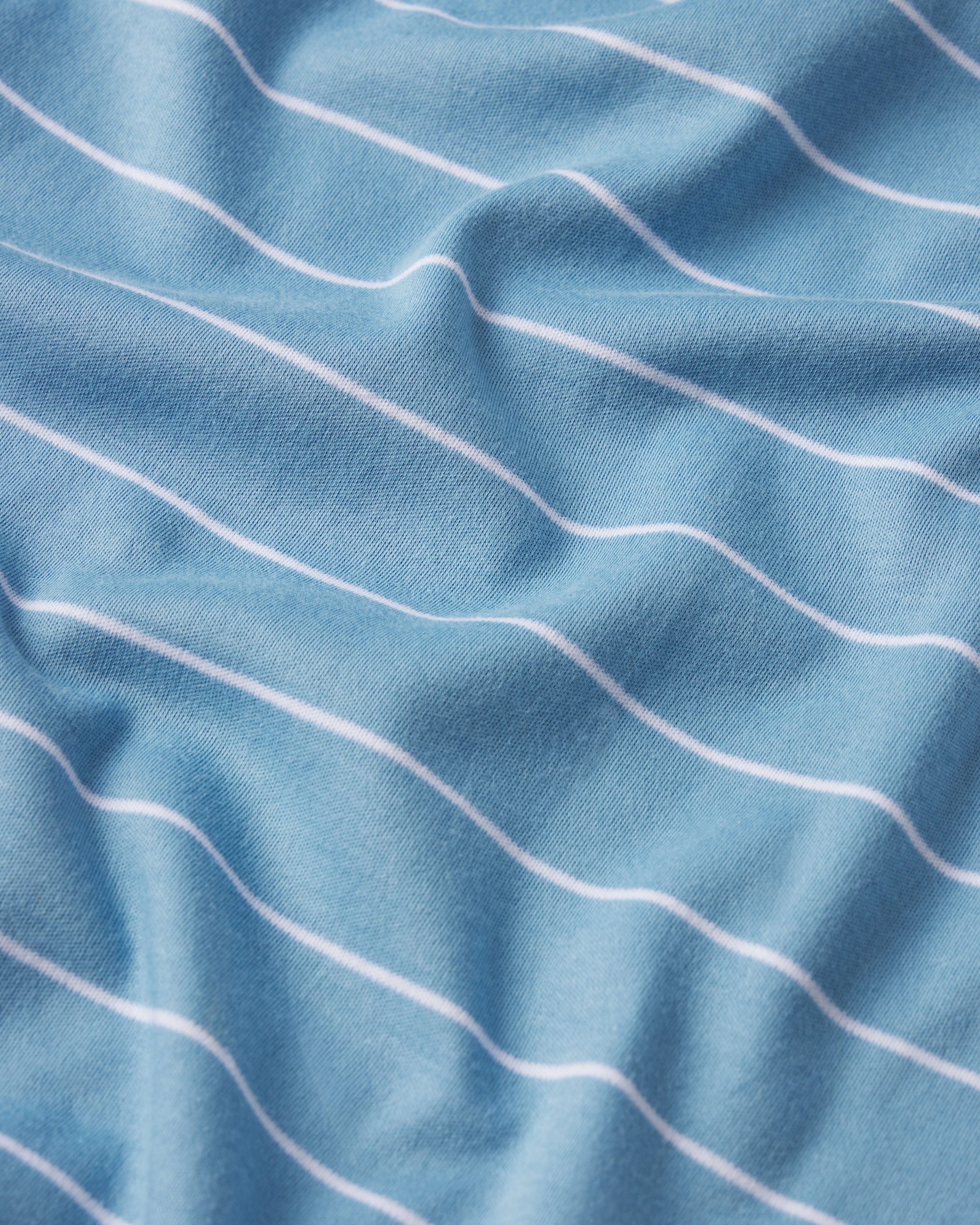The Ruffle Pants Set in Serene Blue Boating Stripe, a thin white stripe set on soft blue, features a feminine ruffle detail across the front and adjustable spaghetti straps with a fully elasticated top. The cropped, wide-leg pants have an elastic waistband. Made from 100% Pima cotton.