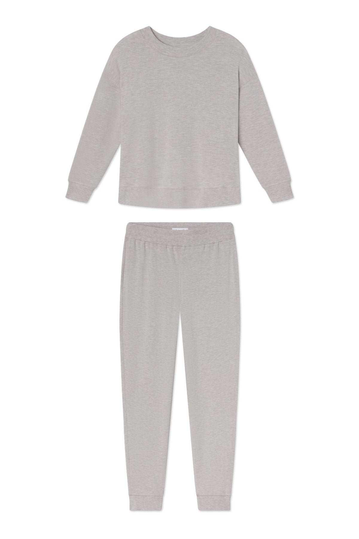The Relax Jogger Set in Heather Gray pairs a slightly cropped crewneck sweatshirt with jogger-style pants with an elastic waistband. Buttery soft with just enough structure, this lounge set is an elevated take on classic sweats — and a favorite for our 5 to 9. Made of 95% modal, 5% spandex.