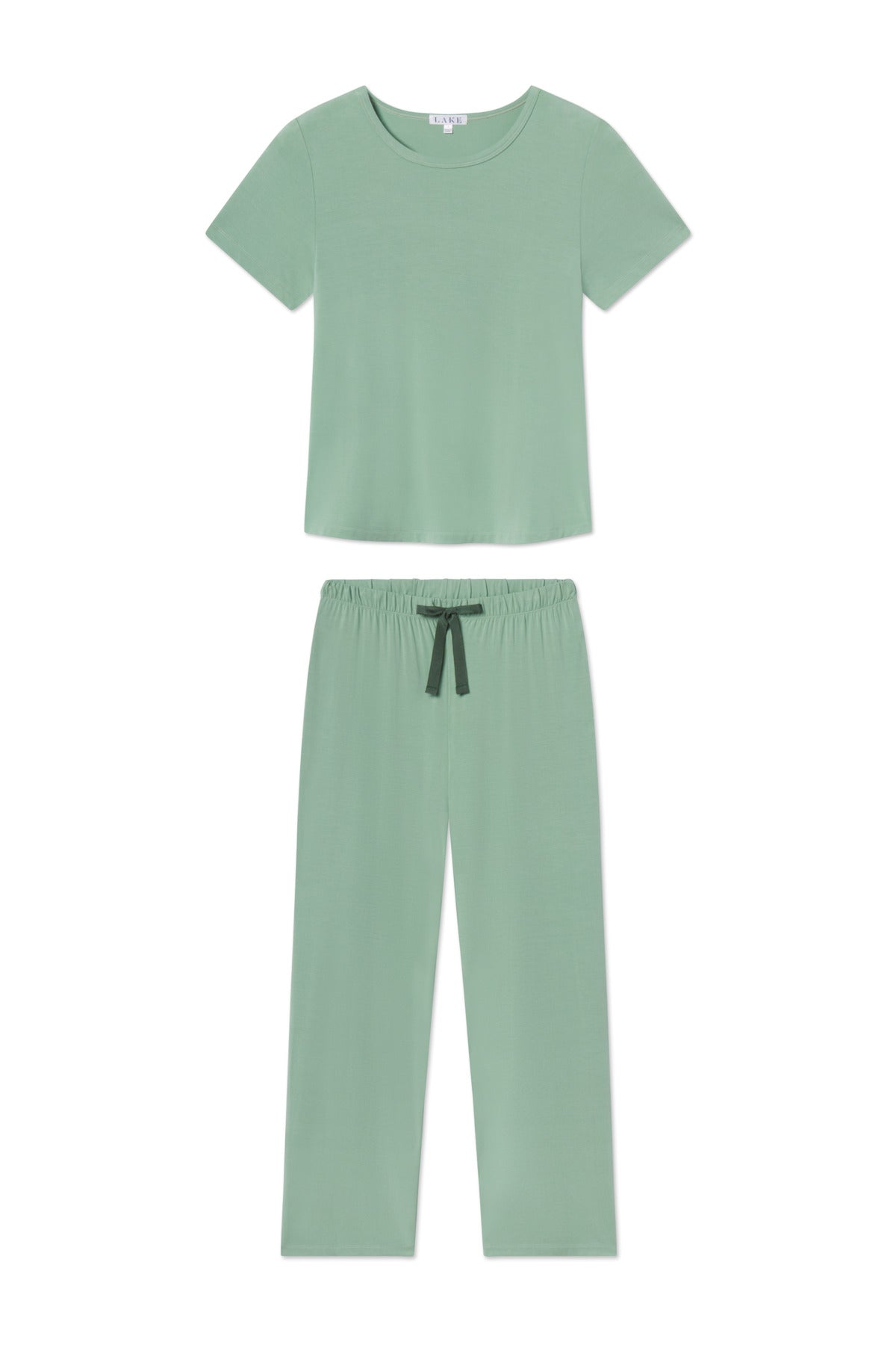 Silky soft with a fluid drape, the DreamModal™ Ribbon Short-Long Set in Granite Green, a muted green, pairs a short-sleeve crewneck top with drawstring pajama pants that feature a contrasting ribbon tie. Made of 95% modal, 5% spandex.