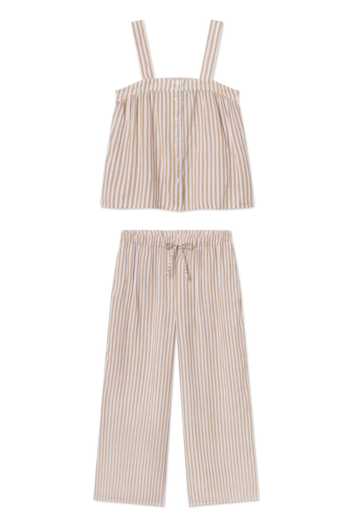 Ideal for hot sleepers in light-as-air gauze, the Hamptons Pants Set in Sandstone Awning Stripe, a warm beige and white vertical stripe, features a button-front tank top with smocking at the back for added comfort. The pants have pockets, a drawstring, and an elastic waistband. Made from 59% cotton and 41% modal.