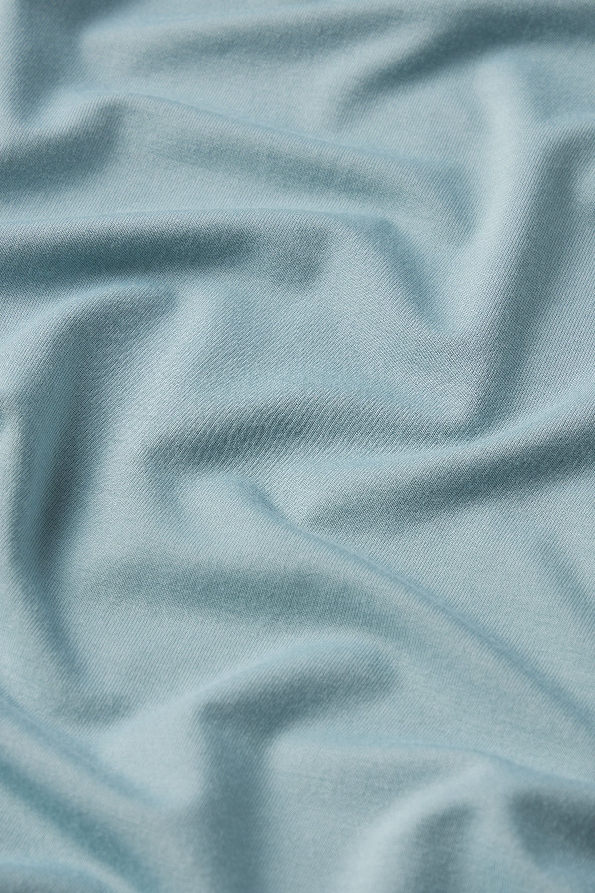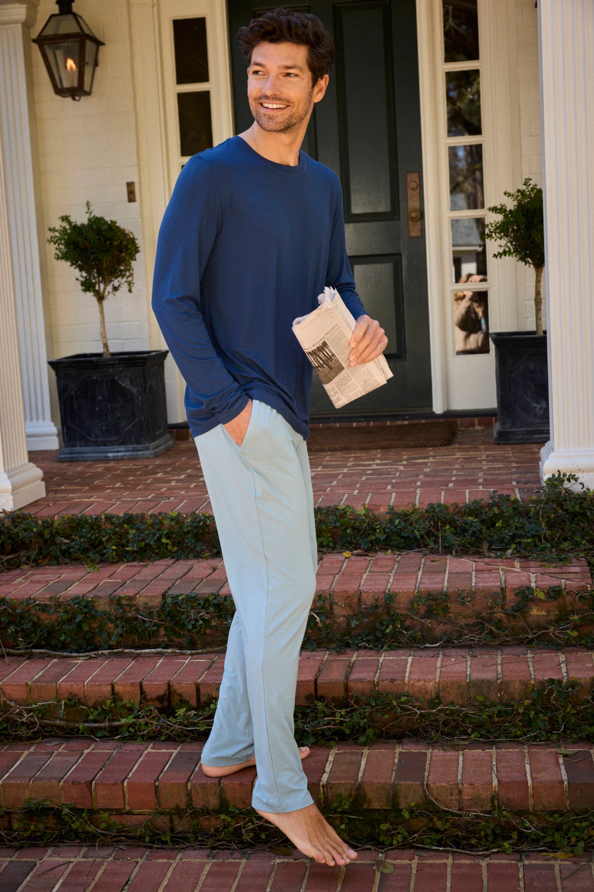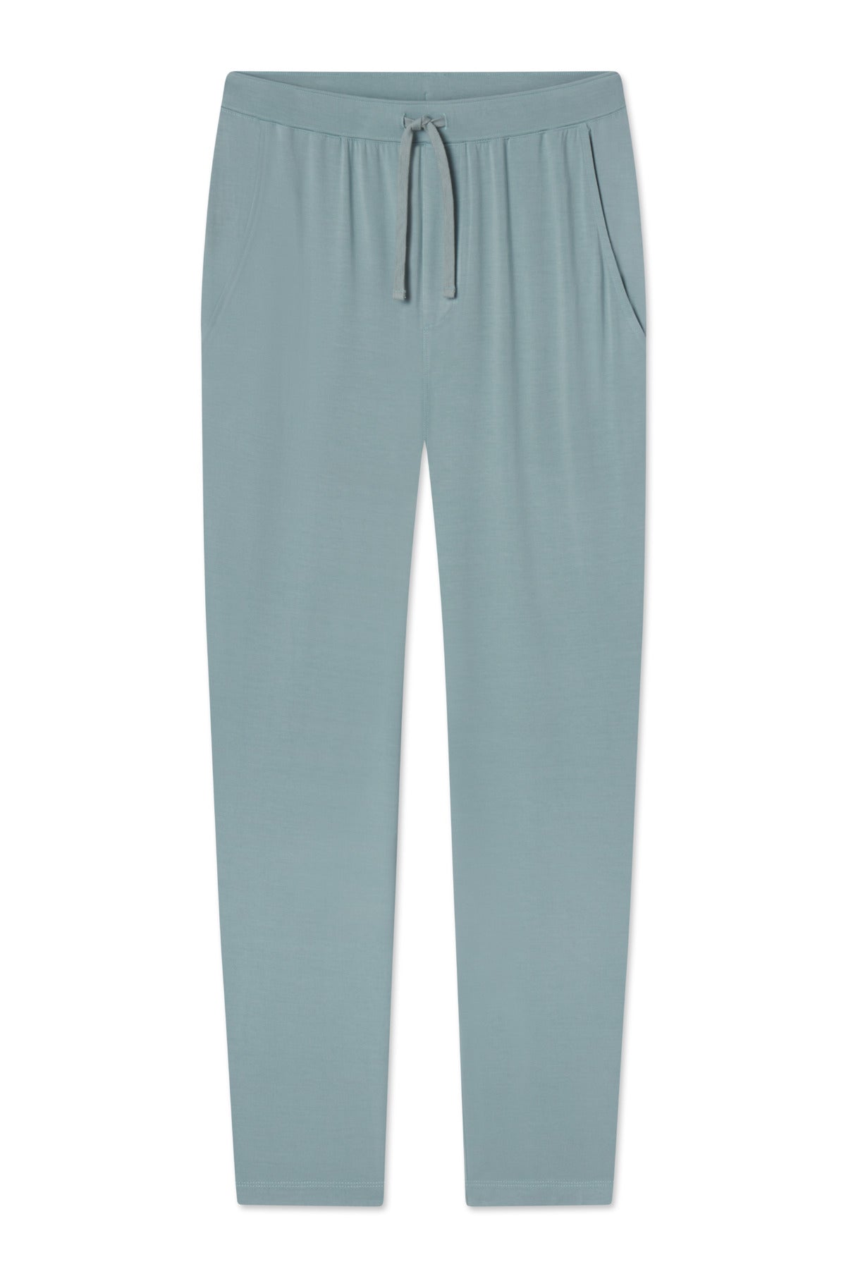 The Mens Bamboo Lounge Pants in Stone Blue, a soft blue-green, feature an elastic waistband with a drawstring tie and pockets. Upgrade your lounge game in this stretchy knit fabric similar to a jersey. Made from 95% bamboo and 5% spandex.