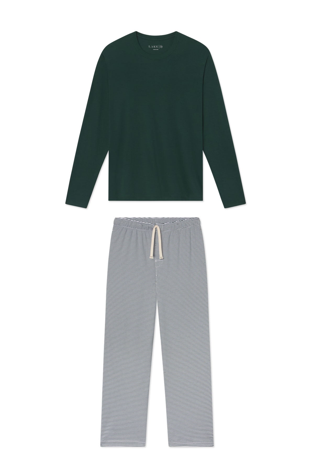 The Men’s Pima Sleep Long-Long Set in Conifer Bar Stripe features pants with an elastic waistband, a faux fly, drawstring tie, and pockets paired with a solid dark green long-sleeve Pima tee. Made from 100% Pima cotton.