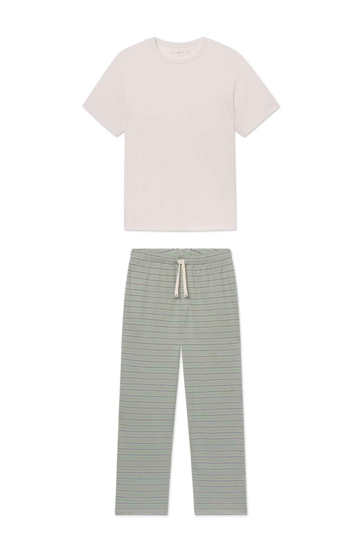 The Men’s Pima Sleep Short-Long Set in Smoke Green Stripe features pants with an elastic waistband, a faux fly, drawstring tie, and pockets paired with a short-sleeve Pima tee. Made from 100% Pima cotton.