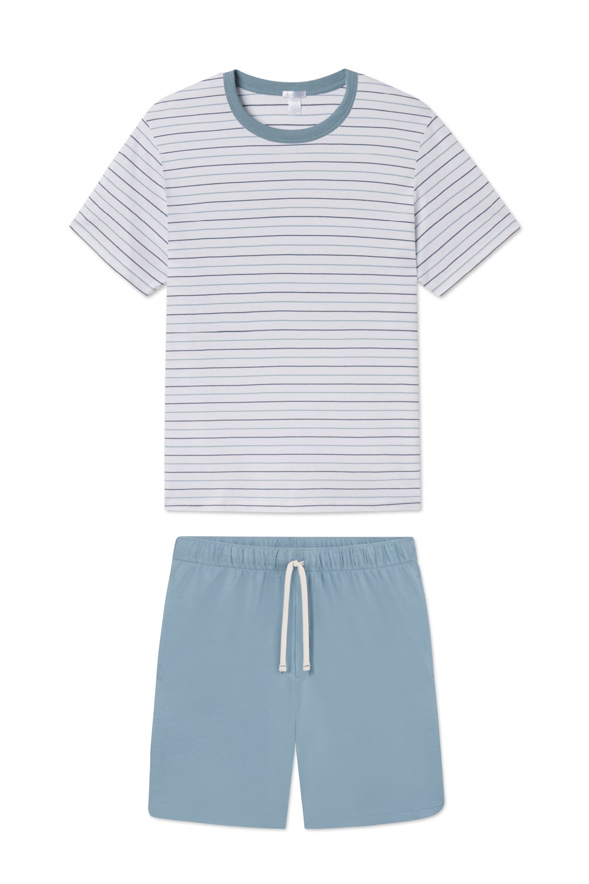 The Men’s Pima Sleep Shorts Set in Marlin Blue Nautical Stripe features a short-sleeve, ribbed crewneck and shorts featuring a functional drawstring, on-seam pockets, a faux fly, and an elastic waistband. Made from 100% Pima cotton.