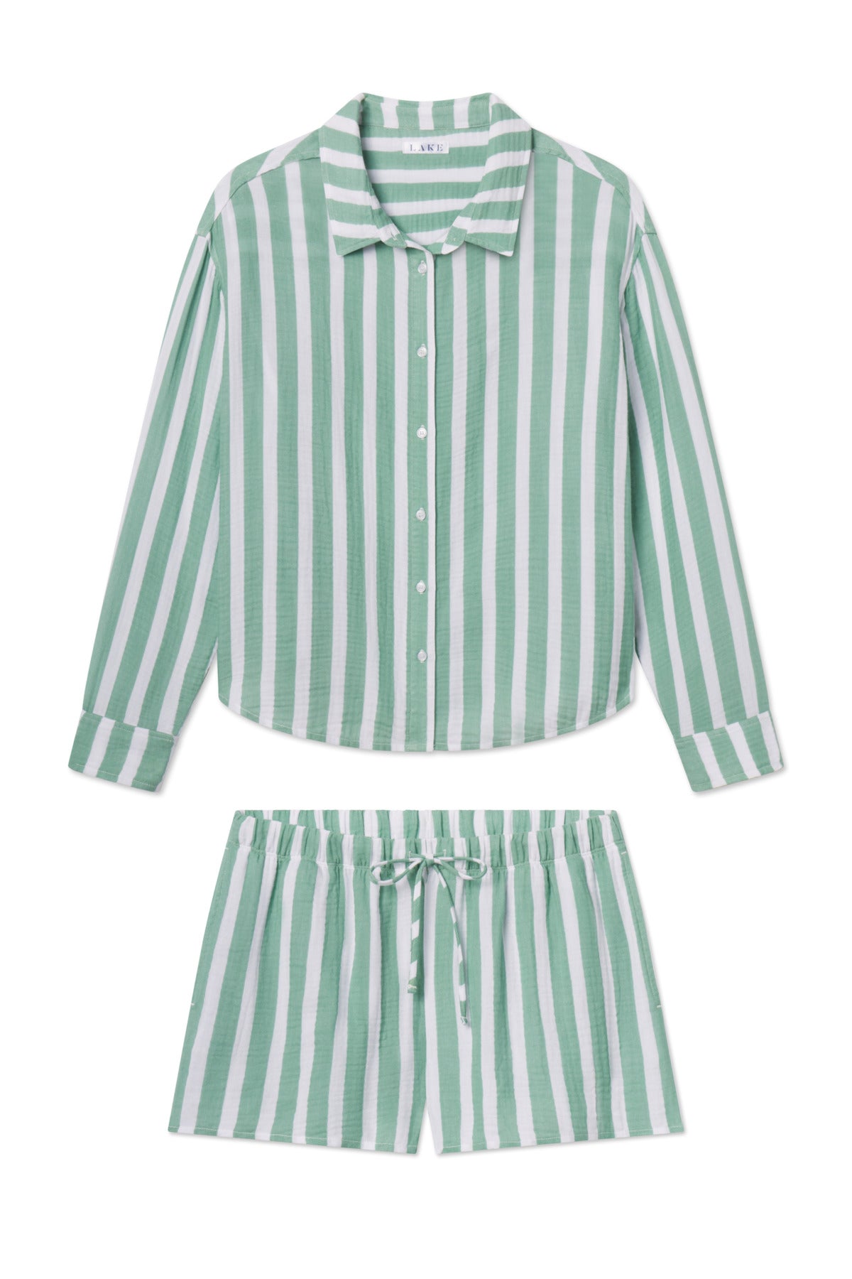 Designed in our lightweight Cotton Gauze, the Nantucket Shorts Set in Granite Green Sail Stripe, a muted green and white vertical stripe, features a collared, long-sleeve button-down top with dropped shoulders and a relaxed fit for extra comfort. The shorts have pockets, a drawstring, and an elastic waistband. Made from 59% cotton and 41% modal.