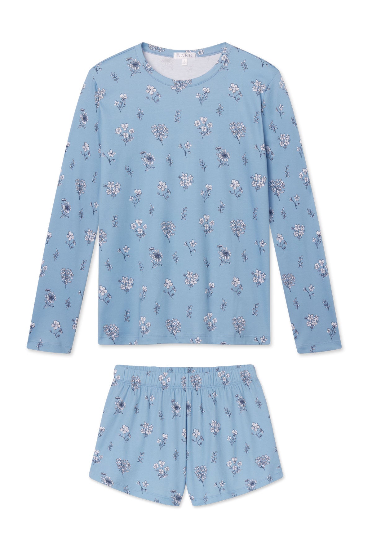 The Pima Crew Long-Short Set in Serene Blue Adeline Floral, a sketched botanical print on muted blue, features a long-sleeve crewneck top and shorts with an elastic waistband and 3″ inseam. Made from 100% Pima Cotton.