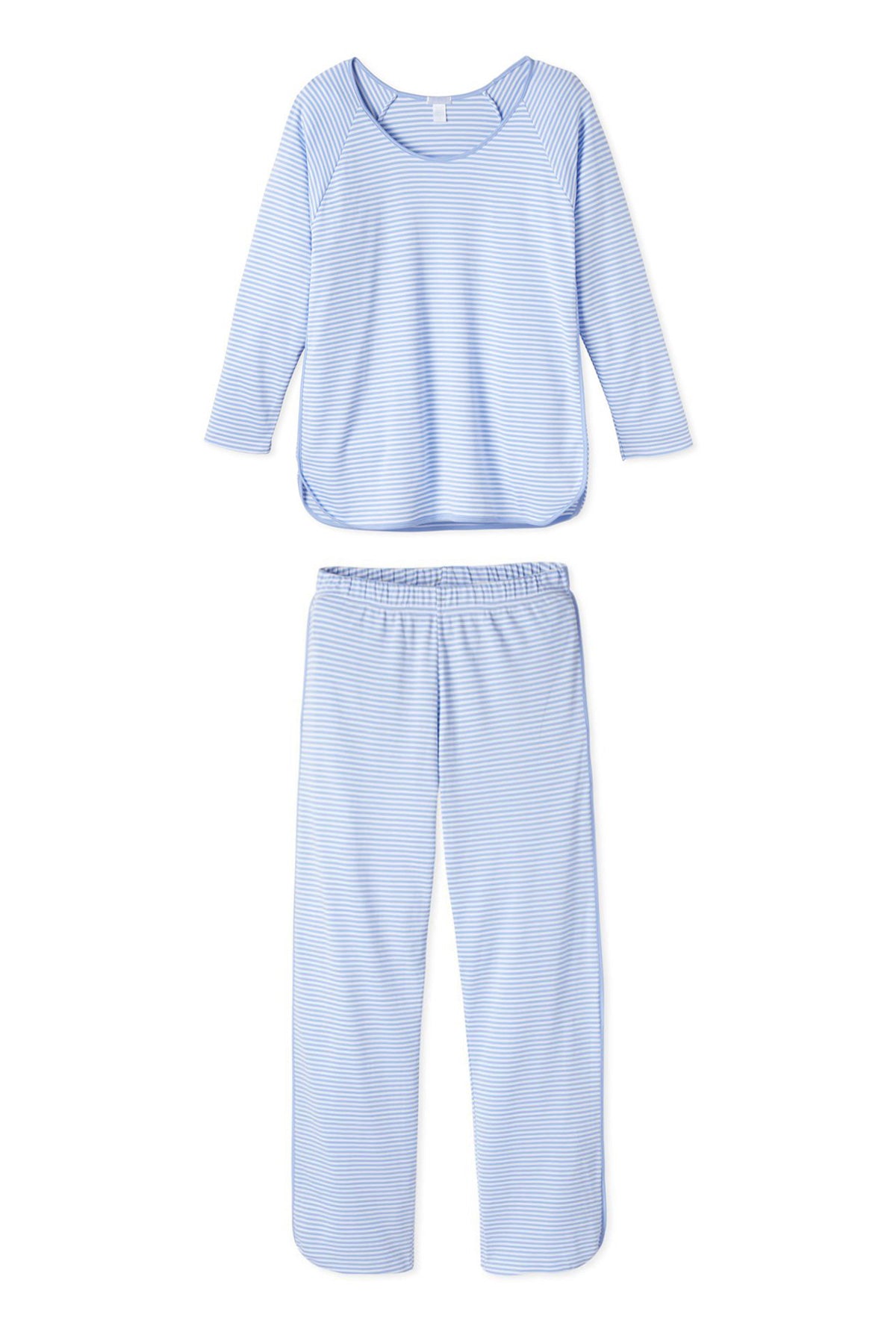 The Pima Long-Long Set in Hydrangea, our best-selling purpley-blue, features a three-quarter sleeve scoop neck top and pants with an elastic waistband. Made from 100% Pima cotton.