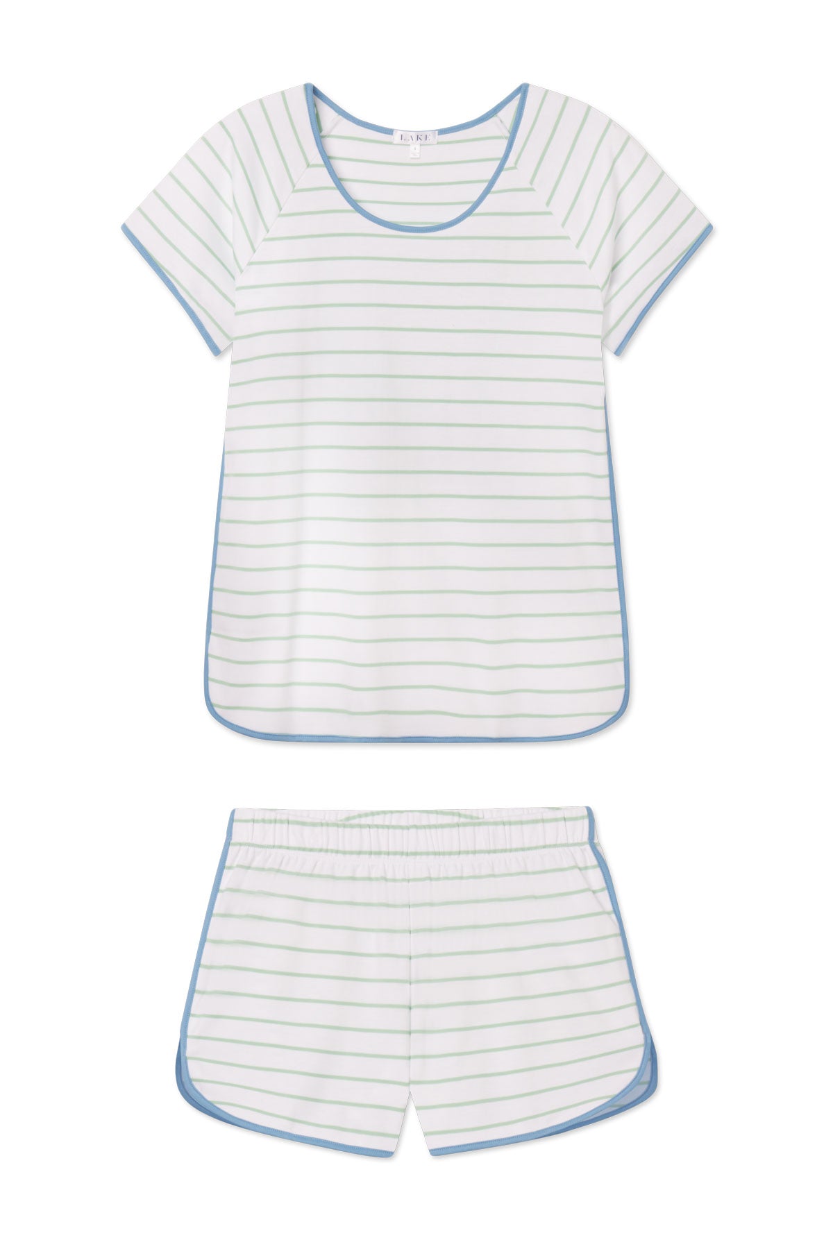 The Pima Classic Shorts Set in Parisian Green Club Stripe, a French green and white stripe with soft blue trim, features a scoop neck, short-sleeve top and shorts with a dolphin hem and elastic waistband. This soft, breathable pajama shorts set has contrast piping throughout. Made from 100% Pima cotton.