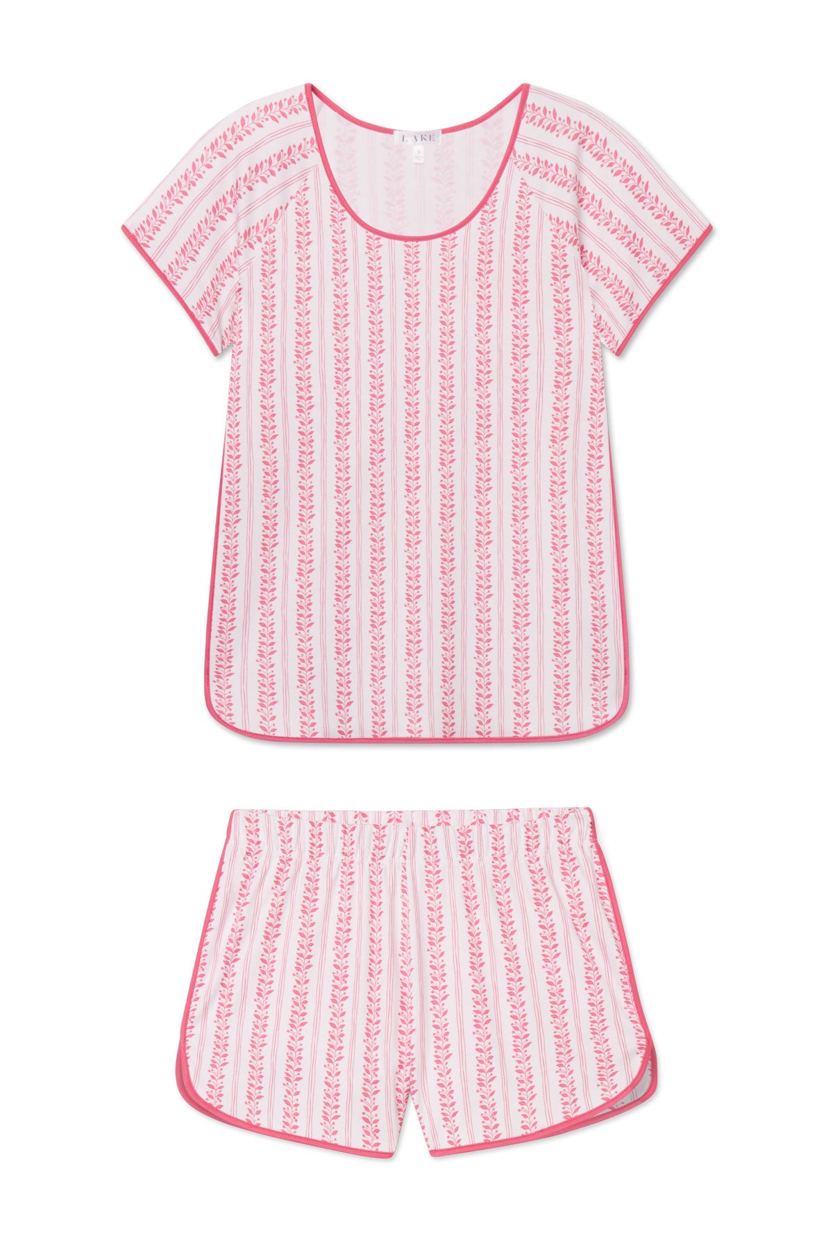 The Pima Classic Shorts Set in Winterberry Jasmine Vine, a striped, muted pink vine print on white, features a scoop neck, short-sleeve top and shorts with a dolphin hem and elastic waistband. This soft, breathable pajama shorts set has contrast piping throughout. Made from 100% Pima cotton.