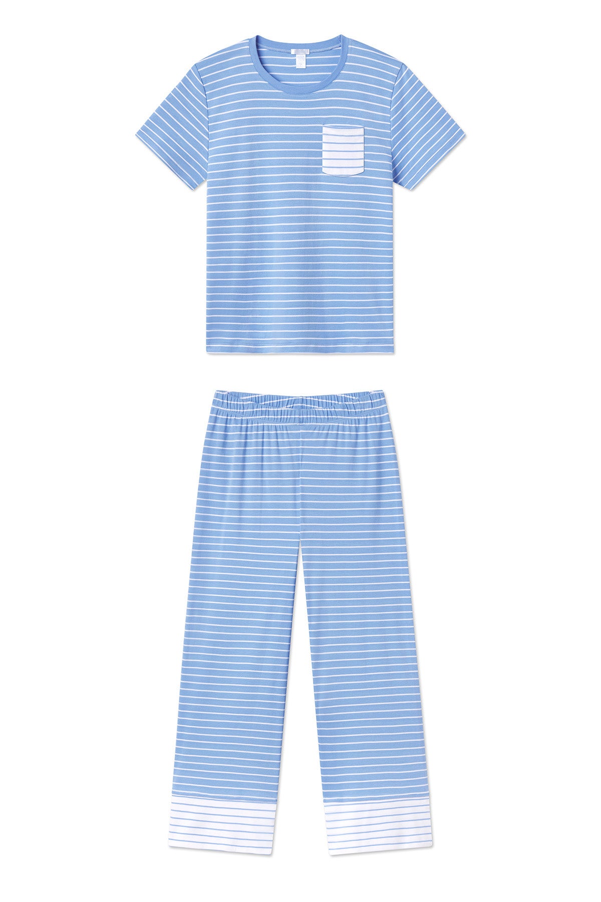 11 Pima Cotton Wide Leg Crew Pajama Set in Mixed Baltic Blue Stripe | Soft Luxury Sleepwear