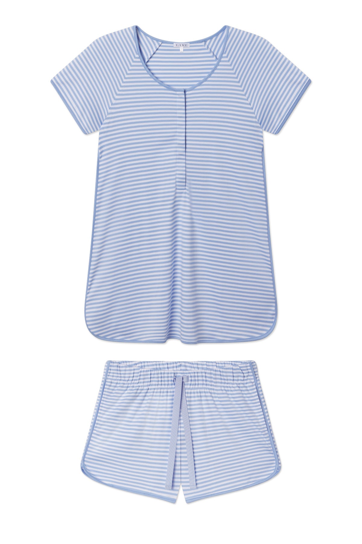 Our new, redesigned maternity styles make the waiting game more comfortable. The Maternity Pima Classic Shorts Set in Hydrangea, our best-selling purpley-blue, features a scoop neck top with a hidden snap placket for nursing or pumping, short raglan sleeves, and room for a bump. The shorts have a supportive elastic waistband, drawstring, and on-seam pockets for the essentials (hi, pacifiers). This soft, breathable maternity pajama shorts set has curved hems and contrast piping throughout. Made from 100% Pima cotton.