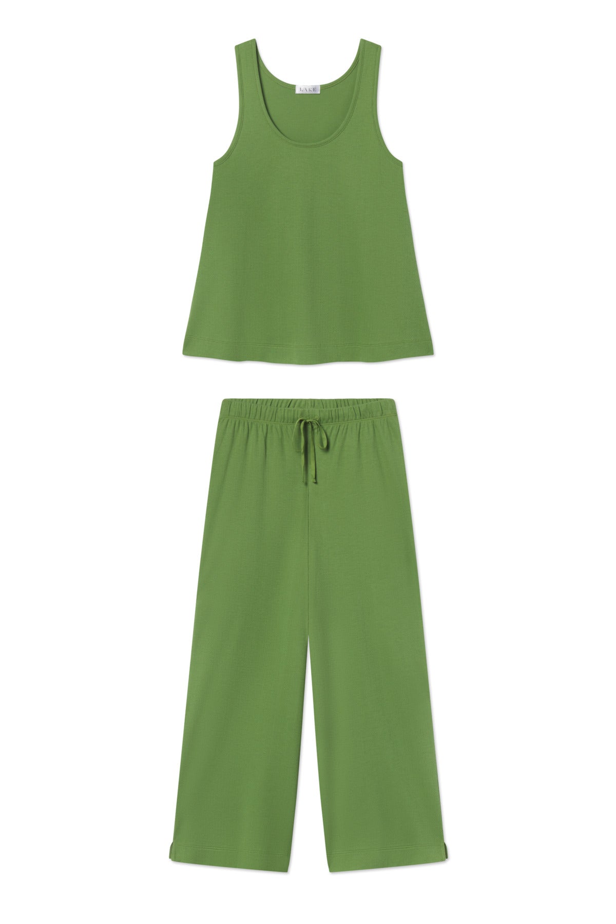 Our favorite Pima in Pointelle. Shown in Willow Bough, a moss green, this pajama set features a tonal patterned weave in a lightweight knit ideal for hot sleepers or warm climates. The scoop neck tank top has a casual swing paired with wide-leg pants with a drawstring tie. Made from 100% Pima cotton.