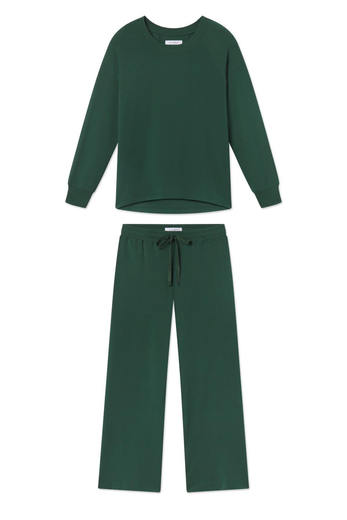 The Relax Pants Set in Trekking Green, a rich, hunter green, features a raglan crewneck sweatshirt with ribbed cuffs. The coordinating cropped, wide-leg pants have an elastic waistband and functional grosgrain ribbon tie. Buttery soft with just enough structure, this lounge set is our favorite to put on at the end of the day. Made of 95% modal, 5% spandex.