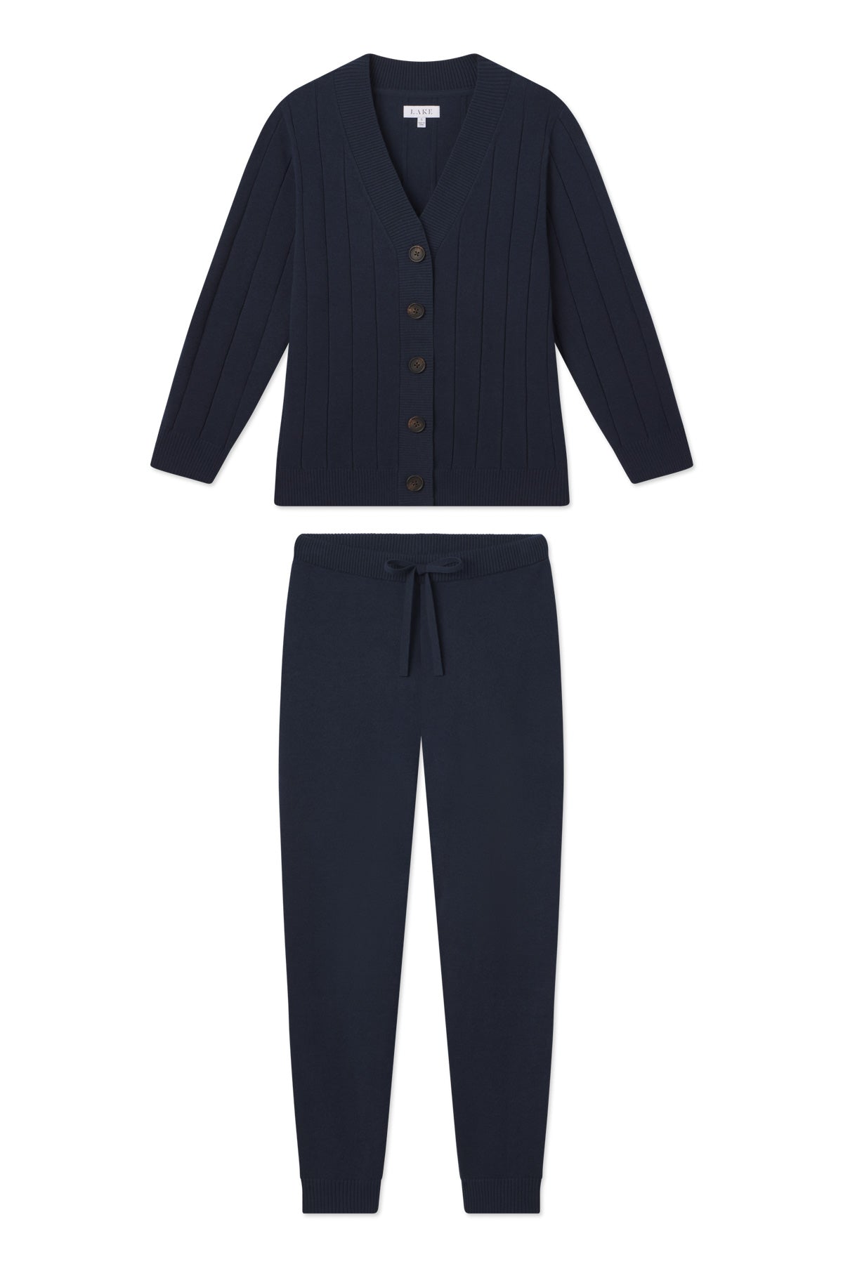 Cozy days at home just got even comfier in this plush, mid-weight lounge set. The Vesper Jogger Set in Deep Navy features a V-neck cardigan with faux horn buttons and a softly ribbed texture in a relaxed, true-to-size fit. The jogger-style pants have a 28” inseam in a smooth, solid weave with a ribbed waist, ribbed cuffs, and a functional drawstring. Designed to wear as a set, or mix it up with your favorite fall separates. Made from 50% polyester, 36% acrylic, 14% nylon.